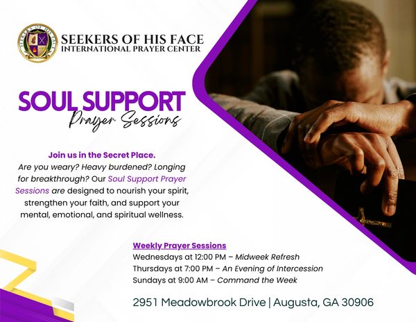 Our Soul Support Prayer Sessions are sacred spaces for healing, restoration, and divine alignment. These gatherings are part of our Soul Support Initiative, designed to nourish your spirit, strengthen your faith, and support your mental, emotional, and spiritual wellness.
