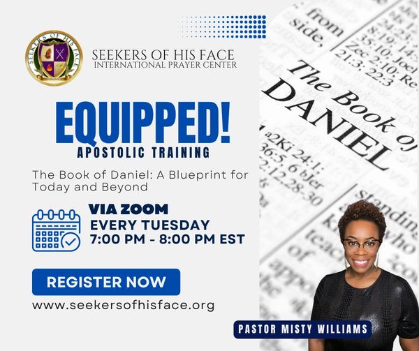 Join us every Tuesday evening for Equipped!, a dynamic virtual Apostolic training designed to activate, mature, and empower emerging five-fold ministry leaders. Through a deep, verse-by-verse study of the Book of Daniel, participants will gain spiritual insight, prophetic understanding, and practical tools for impactful ministry. Whether you're called as an Apostle, Prophet, Evangelist, Pastor, or Teacher, this training will sharpen your discernment, cultivate spiritual discipline, and align you with God’s divine purpose.